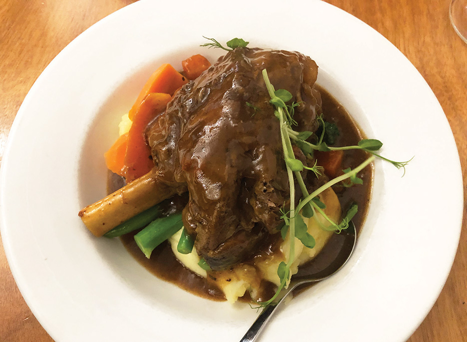 My wife’s lamb shank was humongous and looked so good I almost had a Proustian flashback to my gran’s house in the 1970s. The lovely tender meat was falling off the bone.
