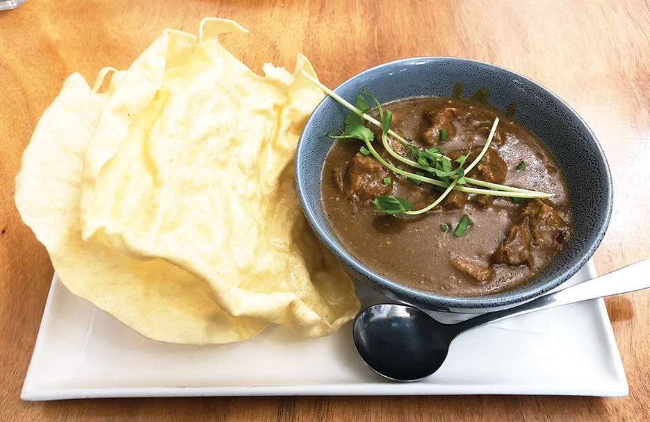 The freshly-made poppadoms were diaphanous and crunchy, with a pleasant trace of oil on the crater-like surface (perfect for scooping up the boiled rice and dark viscous sauce). Delicious.