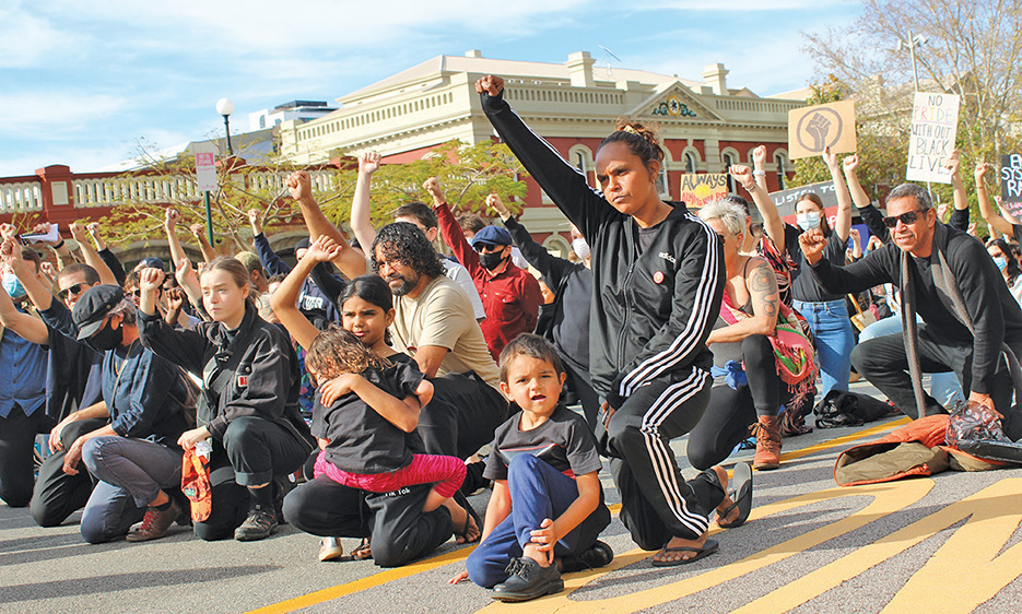 With posters demanding governments address the appalling rate of Indigenous incarceration in Australia and work towards sovereignty for First Nations people, the grassroots group responsible for organising the protest, Boorloo Justice, guided the chanting protesters through the city.