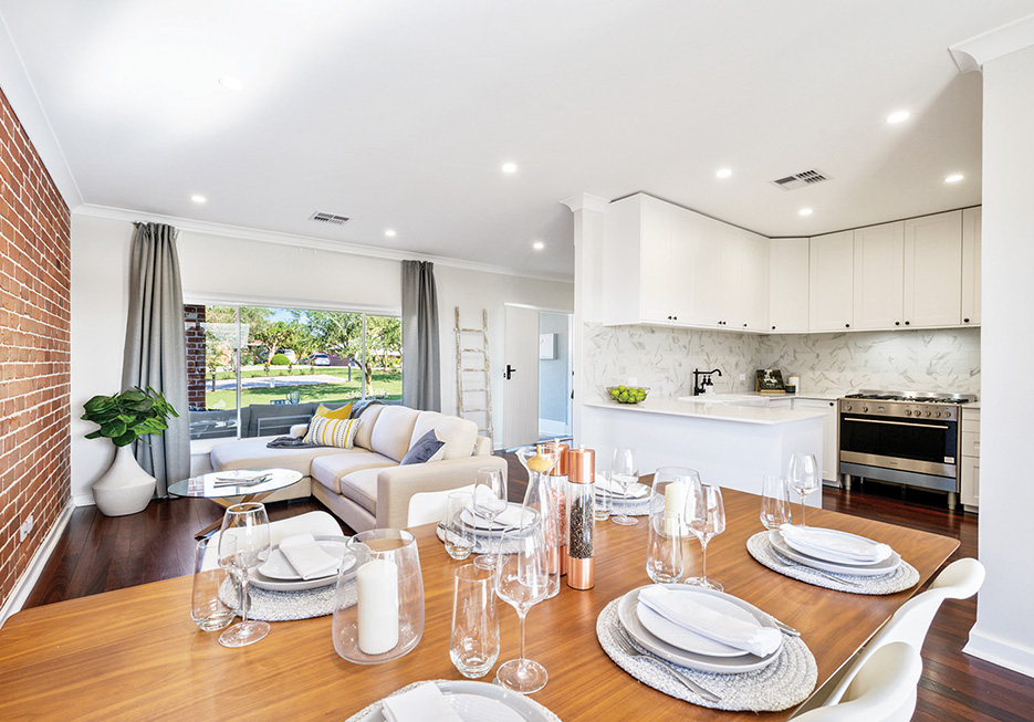 Just when you think the neutral colour scheme in this house might be getting a little bland, a raw brick wall in the lounge creates a pleasant contrast and texture. It’s the perfect spot for hanging a TV and kicking back with Netflix.