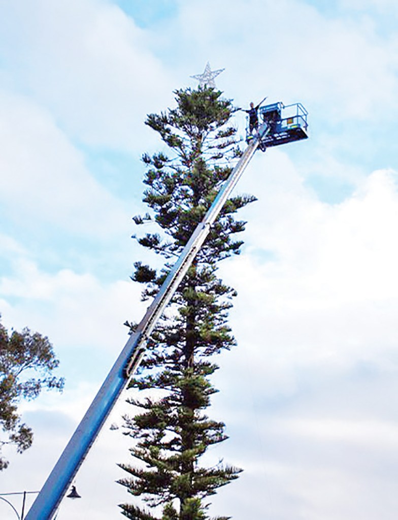 In preparation for the Christmas Festival in Beaufort Street tomorrow (Sunday November 29) Anglican rector Stephen Conway recently braved some rough weather to ride a crane to the top of the massive pine tree in front of St Patrick’s in Mt Lawley.