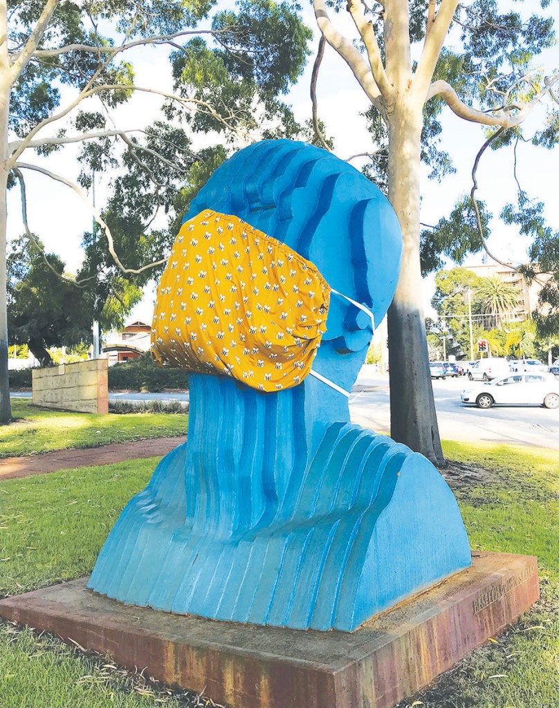 Artist Sarah Chopra’s mask addition for Ken Sealey’s “Beseech” sculpture on Loftus Street is one of the projects funded by Vincent council’s “arts relief grants” from last year.