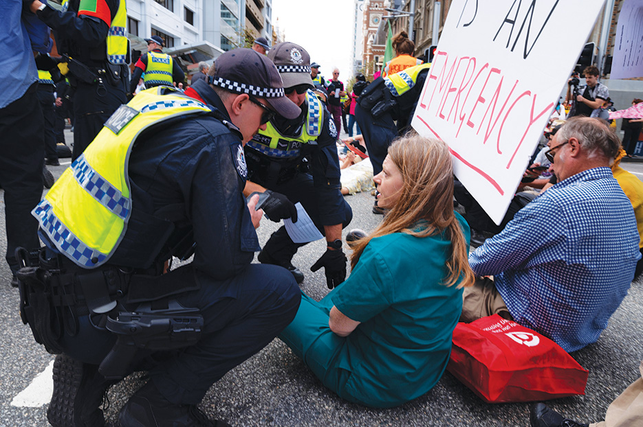 Police arrested 27 people, including Mt Lawley neurologists Carolyn Orr, as they conducted a die-in on the terrace as part of a three-day campaign.