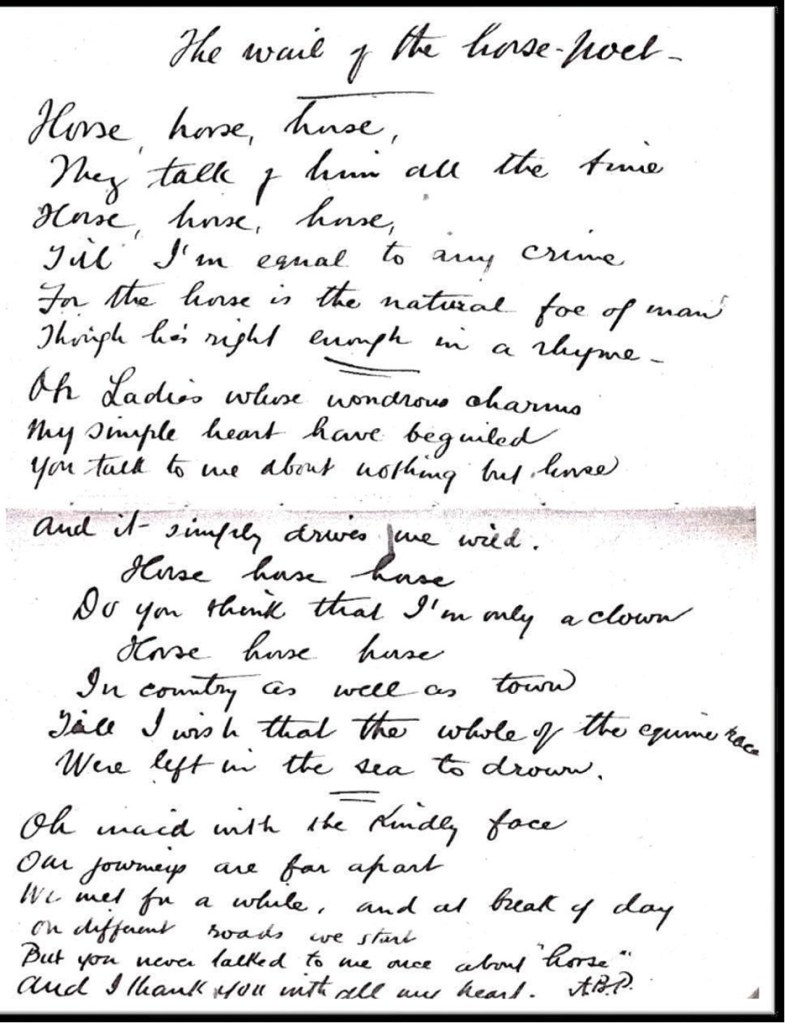 “Horse horse horse; In country as well as town; Till I wish that the whole of the equine race; Were left in the sea to drown,” wrote the author who had previously introduced Australia to its iconic colt from old Regret in The Man From Snowy River.