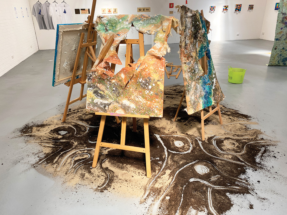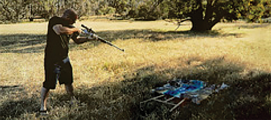 Bradley Kickett stabbed and chopped his canvas with a knife before shooting it with multiple calibre rifles and shotgun shells, as part of his installation Boundary Road.