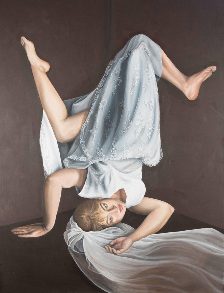 In terms of technical execution, it’s hard to look past Ayla Woodland’s oil painting Next in line, a self-portrait with a literal and metaphorical twist.