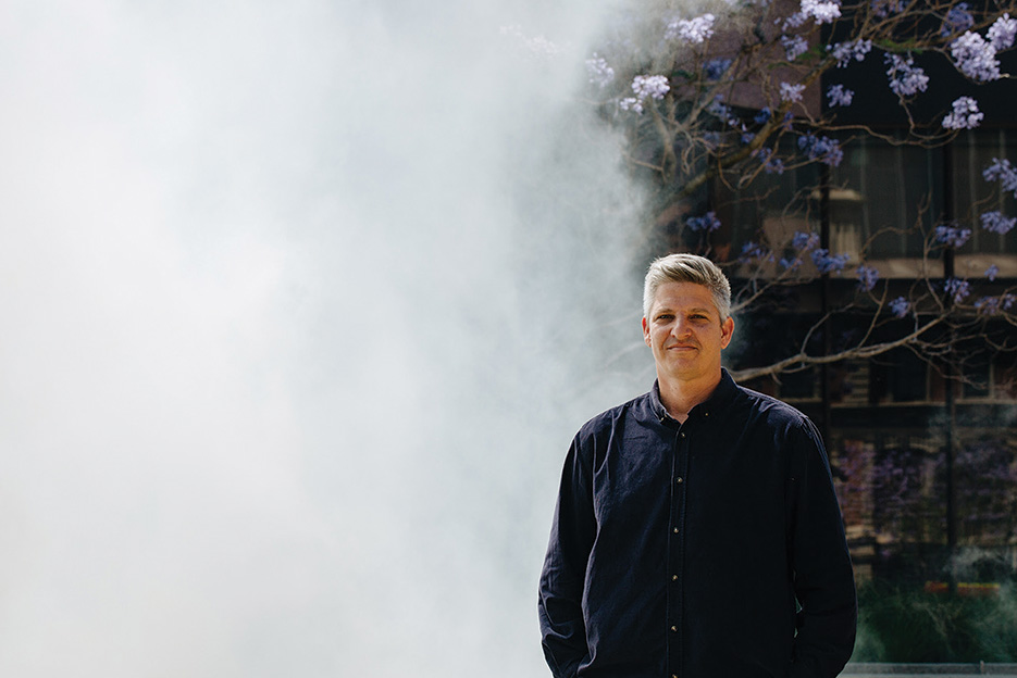 Recently he used massive clouds of steam and fog to replicate a locomotive steam train at the Carriageworks in Sydney, whisking the arts precinct back to its former use as the Eveleigh Railway Workshops.