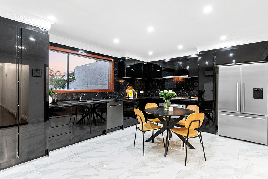 The kitchen is an absolute stunner – glossy, jet-black handleless cupboards and drawers create a seamless futuristic look with the units almost blending into the walls.