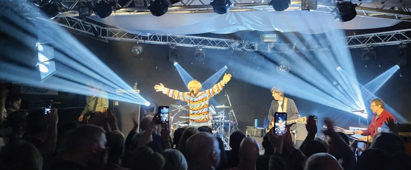 Charlatans’ charismatic frontman Tim Burgess still looked the part – svelte with a peroxide coconut hairdo, he was sporting an ironic Xmas jumper and still had that trademark infectious grin.