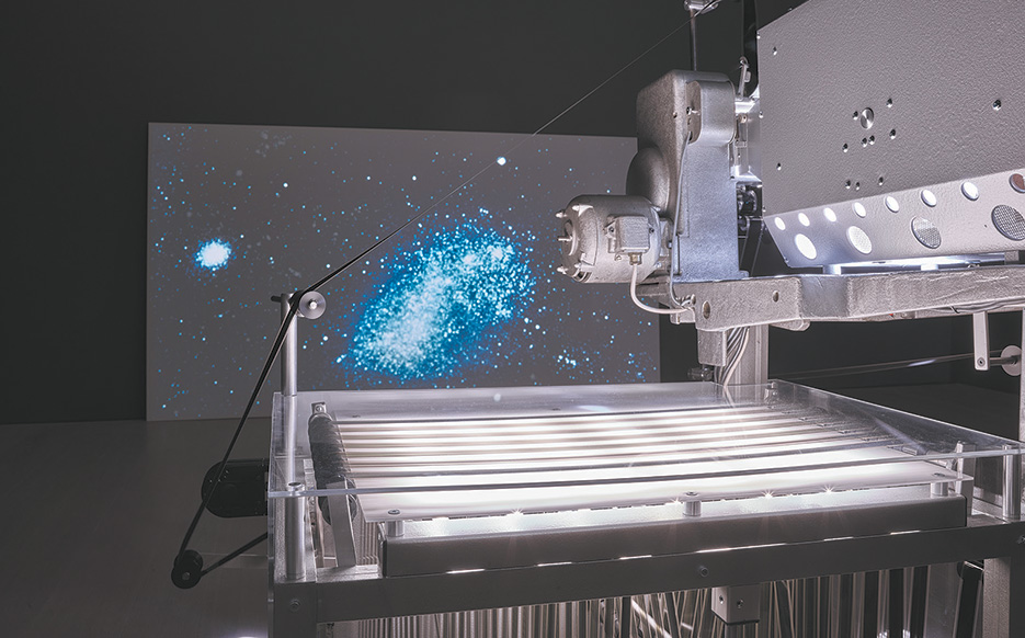 Barba was intrigued by how stars, like projectors, emanate beams of light, and how Leavitt worked like a filmmaker, editing together individual photos just like frames of a film. Presented as an installation using a modified projector fitted with a lightbox, Drawn by the Pulse draws attention to the fleeting frames looping across its surface, image followed by image.