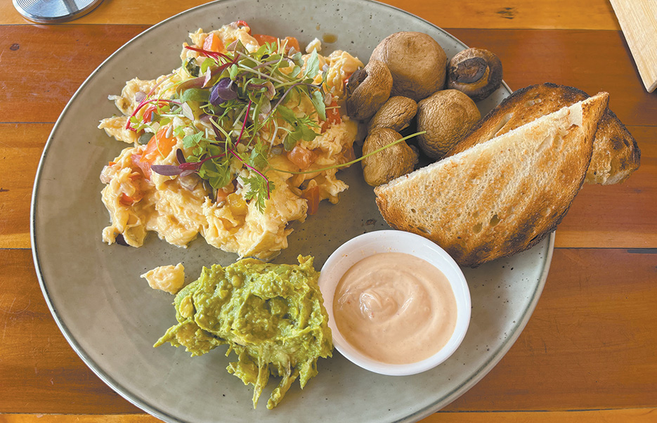 After the man sitting behind me had successfully upgraded his plan to call Alpha Centauri for free on bank holidays, my chilli scrambled eggs arrived ($20 and button mushrooms $4).