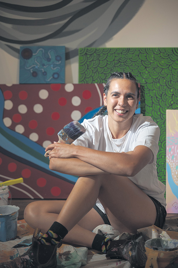 Her murals sprawl across buildings, bus stops, fences, sports team shirts and school uniforms, but this week she’s stepping outside of her commissioned work for her first ever solo show.