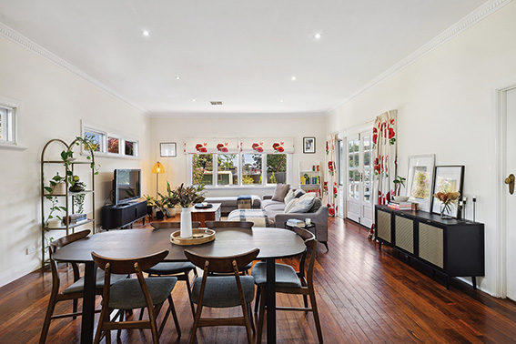 The open plan living/dining/kitchen area is gorgeous with the lovely rich colour from the jarrah floorboards popping against the white walls.