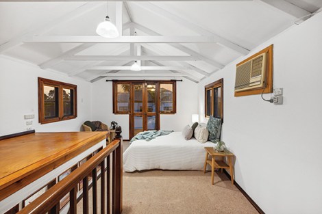 Up there you’ll find a carpeted bedroom with exposed beams and plenty of natural light, courtesy of the many windows.