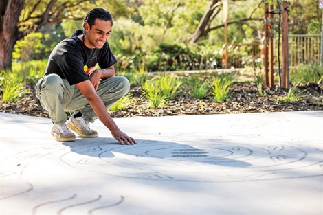 His work is sandblasted into the path and engraved on the interpretation panels, representing the inland lakes connecting to the river through the brook, and the connection between the Noongar people and the Waugal: the river snake said to lay her eggs in the reeds of the brook and then return to lead the hatchlings out to the river.