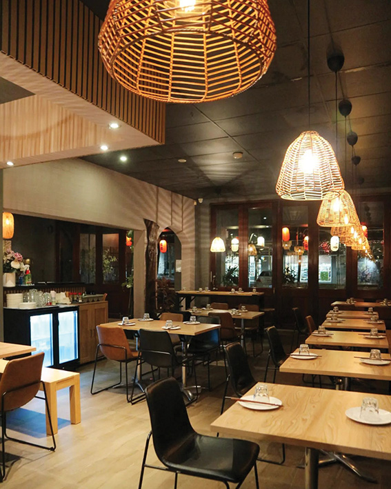 The garish, flamboyance of the old Chinese has been replaced with Japanese minimalism – muted colour scheme, understated decor, wooden carvings and a stylish bar.